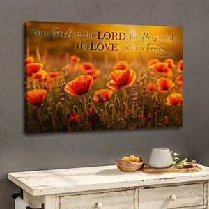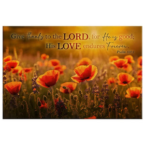 This Christian wall art canvas features vibrant poppies in golden sunlight with the verse, "Give thanks to the Lord, for He is good; His love endures forever" (Psalm 107:1). It brings warmth and serenity, reminding us of God's enduring love. Perfect for the living room, bedroom, or office. Ideal as a gift for friends, family, or church members on birthdays, housewarmings, religious celebrations, or just because.
