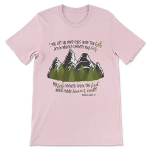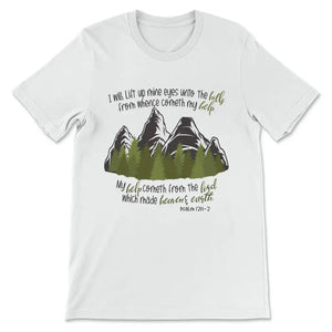Wear this inspiring Psalm 121:1-2 T-shirt and remind yourself and others of God's unwavering support. Featuring a majestic mountain and forest design, this shirt highlights the comforting words, "I will lift up mine eyes unto the hills, from whence cometh my help. My help cometh from the Lord, which made heaven and earth." Perfect for casual wear, church events, or outdoor activities, it serves as a meaningful reminder of faith. Gift it to loved ones for birthdays, holidays, or special occasions to encourage them with God's promise of help and strength.