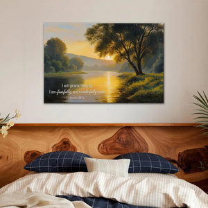 Bring peace to your heart and home with this beautiful reminder from God’s Word. This canvas print features the verse “I will praise thee; for I am fearfully, and wonderfully made” from Psalm 139:14, set against a serene sunset landscape with trees reflecting on a quiet river. The Christian artwork captures the gentle glow of God’s creation, reminding us daily of His careful design and deep love for each of us. Displaying it in your home brings both encouragement and worship, pointing hearts back to the Creator.