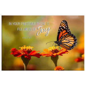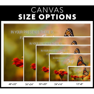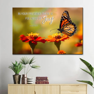 Hang this "In Your Presence There is Fullness of Joy" wall art canvas in your living room, bedroom, or office to inspire positivity and tranquility. Inspired by Psalm 16:11 and beautifully illustrated with butterflies and flowers, it serves as a constant reminder of the abundant joy available in God's presence. This Christian canvas print also makes a thoughtful gift for any occasion.