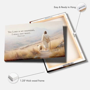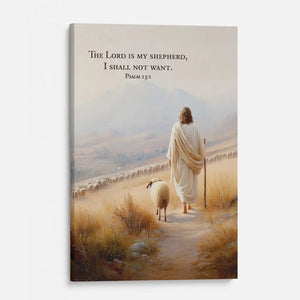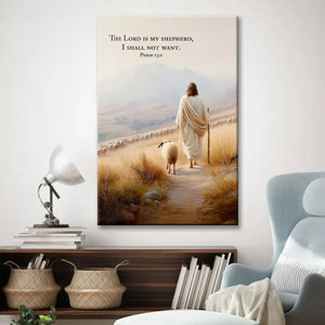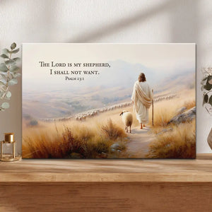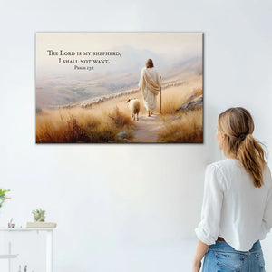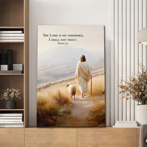 Let this Christian wall art canvas bring comfort to your home and heart, and bless someone you love with the promise that the Good Shepherd never leaves His sheep. This Christian wall art canvas shows Jesus walking with His sheep through a quiet, golden valley, inspired by Psalm 23:1 — “The Lord is my shepherd, I shall not want.” It speaks of deep trust, knowing that no matter what lies ahead, the Lord will provide, protect, and lead. The gentle scene brings calm and comfort, reminding you daily that God cares for you like a shepherd cares for his flock.