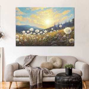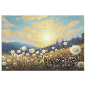This Christian canvas wall art, with the reassuring words "The Lord is my light and my salvation; whom shall I fear?" from Psalm 27:1 KJV, shows a peaceful field of dandelions at sunset. It's a wonderful reminder of the Lord being our guiding light and protector. It's a perfect gift to encourage and comfort friends and family.