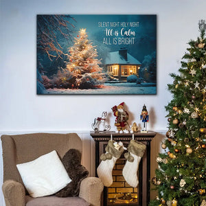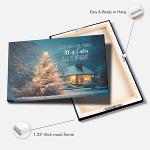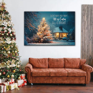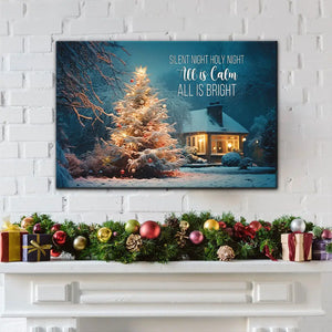 Bring peace and joy into your home with this beautiful Christmas wall art canvas. Featuring a glowing Christmas tree in a snowy yard, it reminds us of the calm and brightness of the holiday season. The words "Silent Night, Holy Night, All is Calm, All is Bright" add a sense of warmth and serenity.