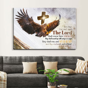 This Christian wall art canvas features a soaring eagle artwork with the powerful message of Isaiah 40:31 KJV "But they that wait upon the Lord shall renew their strength; they shall mount up with wings as eagles; they shall run, and not be weary; and they shall walk, and not faint," reminding us that those who wait upon the Lord will renew their strength and soar on wings like eagles. Making it the perfect addition to your living room, bedroom, or office. With its powerful message and stunning design, this "Soaring Eagle, They That Wait Upon the Lord Isaiah 40:31" wall art canvas makes the perfect gift for anyone who wants to add a touch of inspiration and beauty to their living space.
