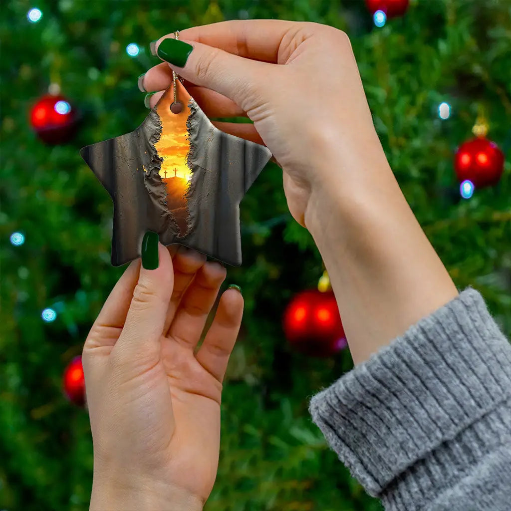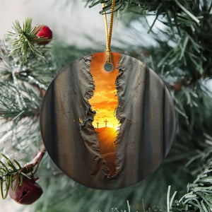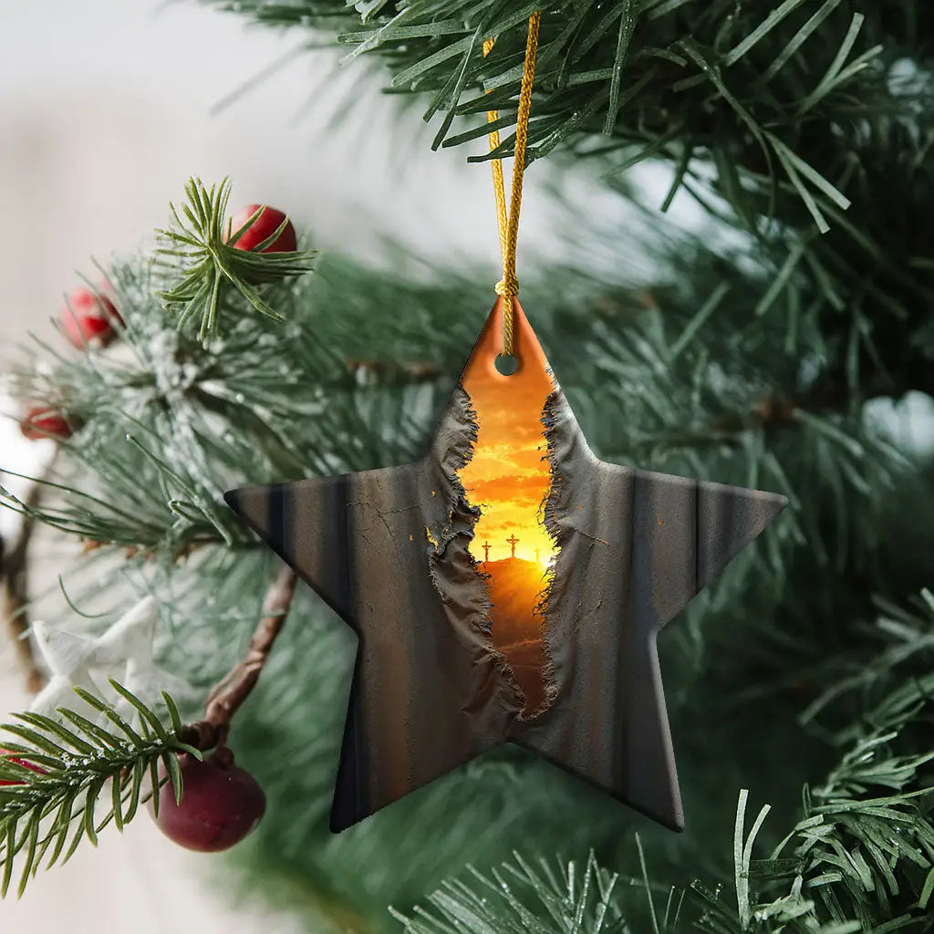 This Christian Christmas Ornament powerfully symbolizes Christ’s sacrifice and the hope it brings. The torn veil shows that Jesus’ death removed the barrier between God and humans, giving believers direct access to Him. Three crosses glow at sunset, reminding us of God’s love and grace. Now we may approach Him with confidence and boldness.