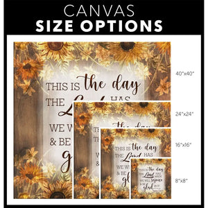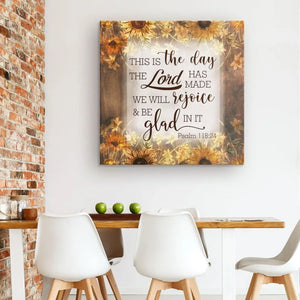 Brighten your space with this uplifting Christian wall art canvas featuring Psalm 118:24, "This is the day the Lord has made; we will rejoice and be glad in it." Surrounded by vibrant sunflowers and delicate leaves, this design brings warmth and joy to any room.