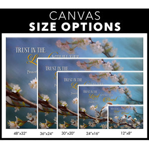 Display this 'Trust in the Lord With All Your Heart' wall art canvas, featuring the timeless wisdom of Proverbs 3:5 alongside a design of sparrows and cherry blossoms. It serves as a daily reminder to place trust in the Lord at all times. Perfect for any living space, office, or bedroom, this piece invites peace and reflection. It also makes a meaningful gift for friends and family on any occasion.