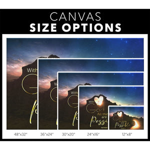 This Christian wall art canvas features the Matthew 19:26 Bible verse 'with God all things are possible' with the empty tomb. The powerful Scripture on this Christian canvas wall art makes this a thoughtful gift for any occasion to inspire men and women to take God at His Word—everything is possible with Him.